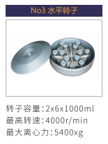 | No3 | 水平轉(zhuǎn)子 | 2×6×1000ml | 4000r/min | 5400xg |